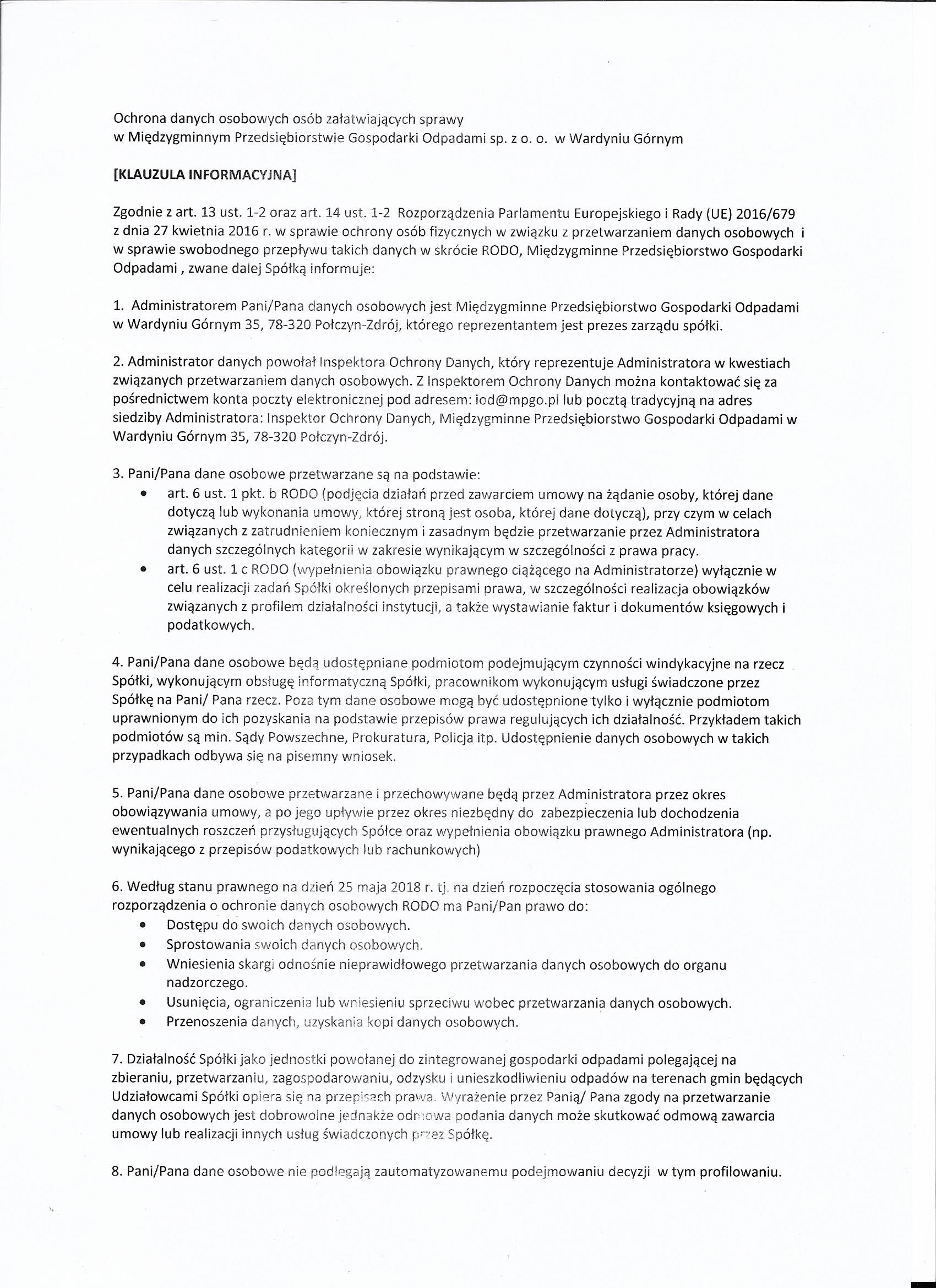 Klauzula informacyjna dla osób załatwiających sprawy w MPGO Sp. z o.o. w Wardyniu Górnym